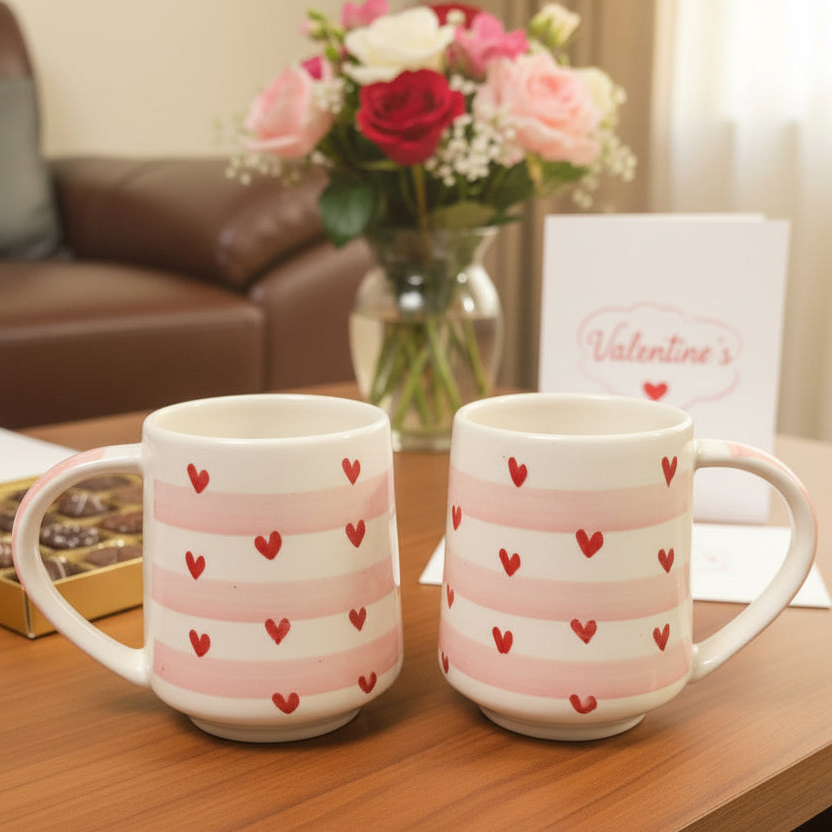 Design: It features a white base with soft pink stripes and small, hand-painted red hearts. This "heart-filled" design is often associated with a Pinterest aesthetic & It typically has a glossy, glazed finish that enhances the vibrant colors and makes the surface smooth to the touch.