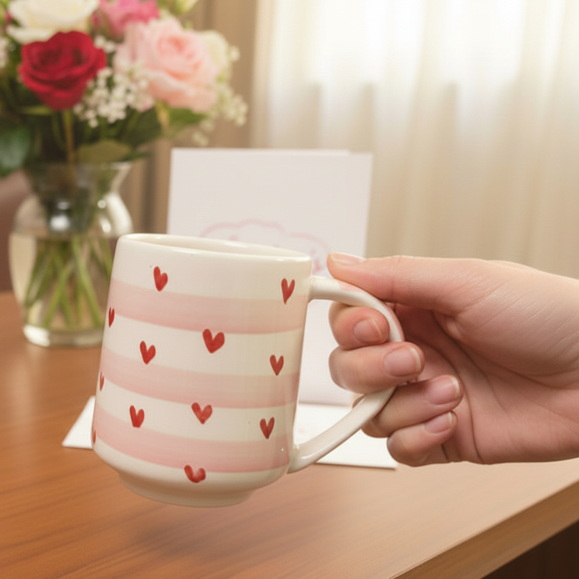 Celebrate love in every sip with this charming 300 ml coffee mug, adorned with hand-painted red hearts dancing across a soft pink and white striped backdrop. Each mug is a unique work of art, making it the perfect companion for your morning coffee, afternoon tea, or a thoughtful gift for someone special. Ideal for heart lovers and those who appreciate handcrafted details that make ordinary moments feel extraordinary.